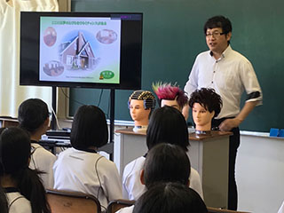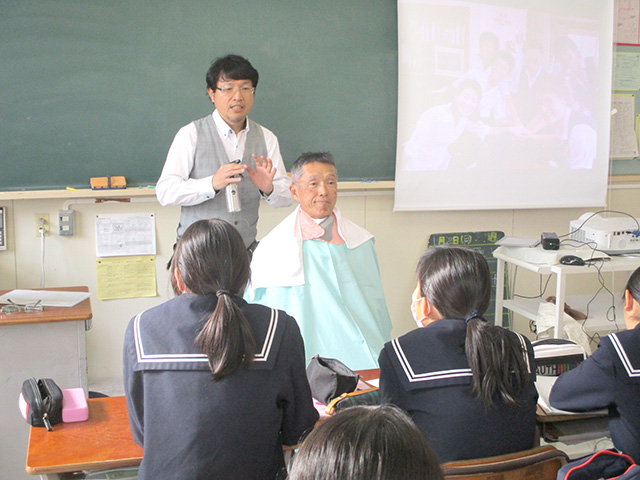 理容の仕事を通じて仕事の楽しさややりがい、また厳しさなど話しました。また2人の先生をモデルにしてコミニュケーションの大切さや相手を理解することの大切さを実演を通して伝えました。