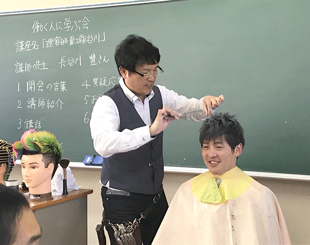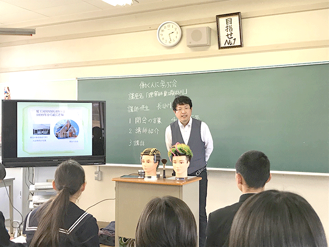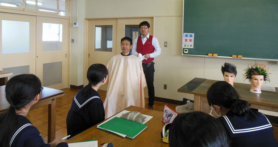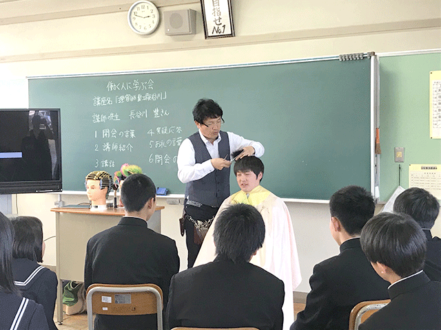 1月24日(金)扶桑中学校にて1年生を対象に授業を行いました。理容の仕事を通じて働くことの意義や楽しさ、厳しさなどを話しました。また先生をお客様に見立ててコミュニケーションの重要性や人を理解することの大切さを伝えました。