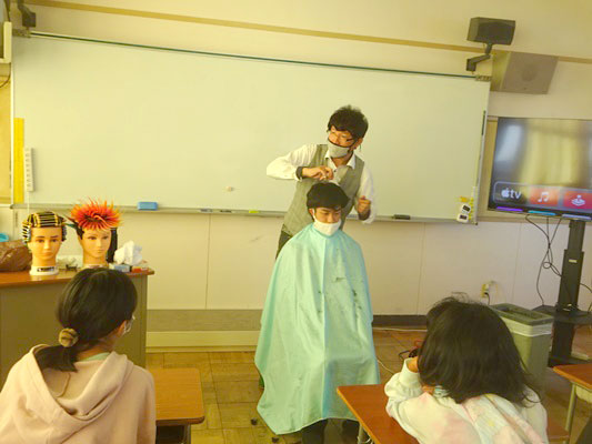 2人の先生をモデルにカットの実演を通して仕事の面白さや難しさまたコミニュケーションの大切さなどを伝えました。