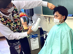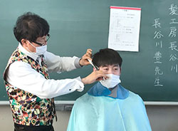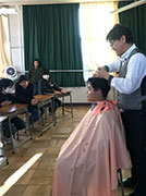 先生2人をモデルに理容の仕事の楽しさや難しさ、またコミニュケーションの大切さを伝えました。